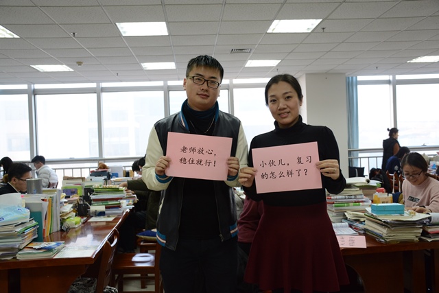 两位老师来到图书馆七楼的考研自习室,走到学生们中间与他们交流,关切地询问同学们的复习迎考情况。杨一帆希望同学们认真做好考试准备,同时做到劳逸结合注意身体。刘伟也为大家提了一些建议,他希望考生们保持良好心态,认真复习,克服自身短板,以最佳状态参与每一场考试,为考研学生树立了更多的信心。随后,两位老师将精心准备的手写卡片及营养品发放到考研同学手中,还询问了同学们的报考学校以及专业方向,对他们的考研状况予以悉心的指导。感受到老师们真挚的关怀,同学们纷纷表示,一定会以最佳状态迎接考研,不辜负自己的理想和老师们的关心与支持。最后,所有考研的学生一起喊出“考研必胜”的口号,以表达出自己的决心和意志。