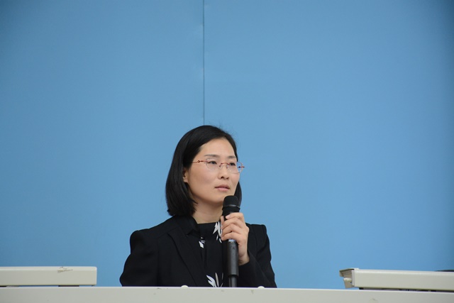 第二位主讲人赵晓珂通过提问“我们党的初心和使命是什么”引出主题——“不忘初心跟党走,青春建功新时代”,并从三个部分展开。首先,她介绍了我国在党的十八大以来发生的历史性变革,通过解读中国理念、中国智慧、中国方案、中国机遇,指出是“人民当家成就新时代”。然后,她通过特朗普访华、孔子学院等关键词介绍了五年来我国的文化建设情况,并对文化自信进行解读,进而指出是“文化自信铸就新辉煌”。最后,她从毛泽东主席的青年寄语讲到习近平总书记对青年的多次嘱托,强调“青春梦想担当新使命”,并对青年学子提出三点期望:一要胸怀大局,顺势而为,有理想;二要勤奋好学,只争朝夕,有本领;三要筑梦不息,追梦不止,有担当。