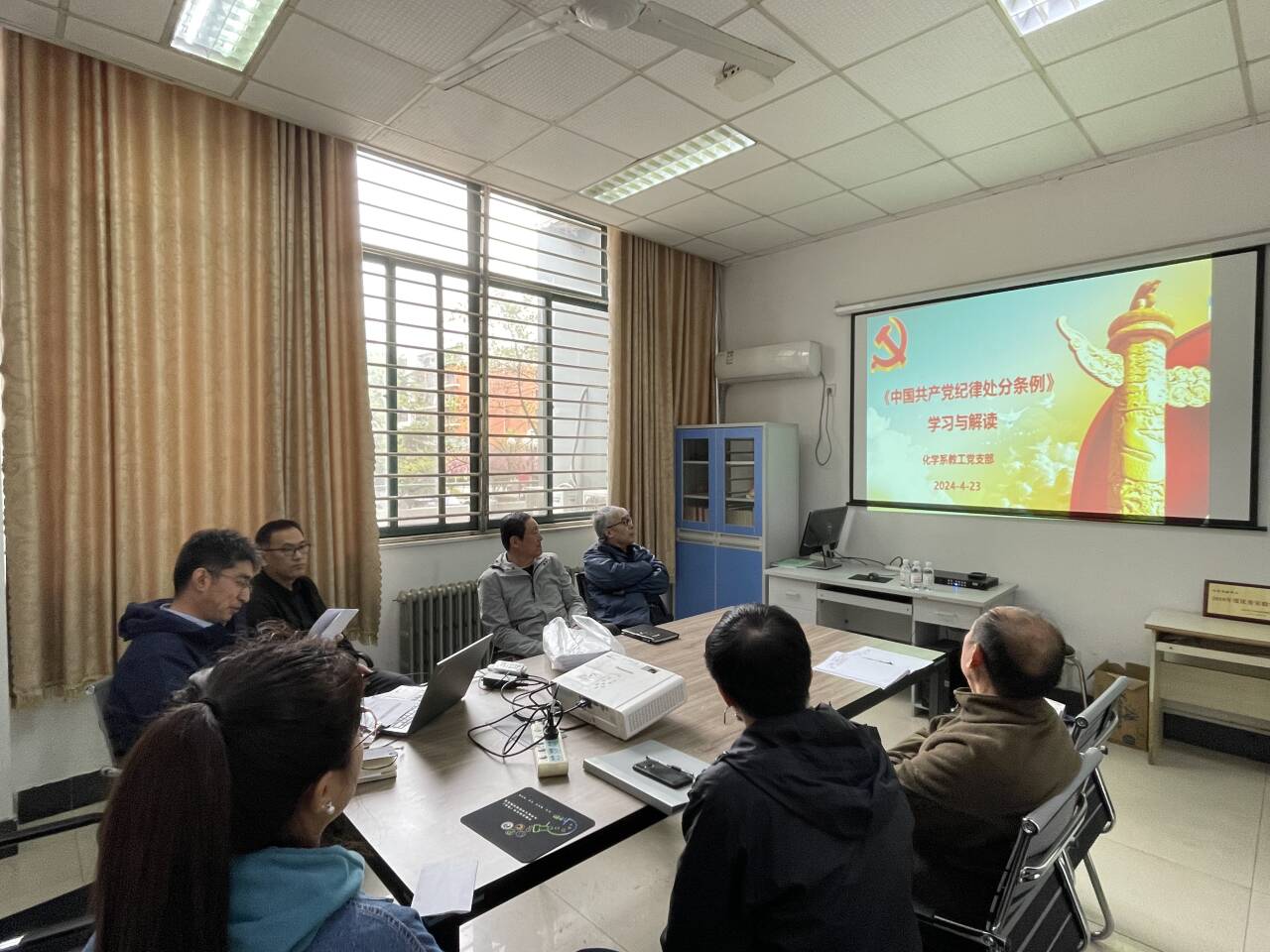 4月23日,在基础实验楼A106室,化学系党支部组织党员学习《中国共产党纪律处分条例》,并深入研讨了《教职工年度考核实施办法》以及《教职工处分规定的通知》,党支部无课老师参加了此次学习。此次学习活动突出了纪律建设在党的建设中的重要性,为进一步提升党员素质和团队凝聚力奠定基础。