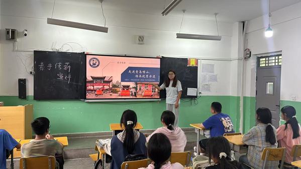 8月14日,实践队员杨欣姗在甘肃省甘南藏族自治州迭部县初级中学,通过故事分享会的形式,生动展现青岛非遗的传承故事。100多名学生们聆听着背后的山海故事,在互动中感受沿海与高原文化的碰撞,让崂山区非遗在千里之外的校园扎根生长。