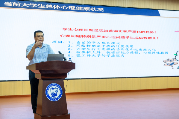 韩旭东就大学生心理健康问题向与会家长做专题讲座,他以全国青少年心理健康现状为引,引用国家卫生健康委报告等数据强调了防范青年危机事件发生的重要性,展开分析了大学生心理疾病的成因、大学阶段的心理困扰、家庭如何面对心理问题三方面内容,呼吁学生家长关心关注学生的心理健康状况。随后他又向新生家长们分享了几种亲子沟通技巧,帮助学生家长良好处理亲子关系。