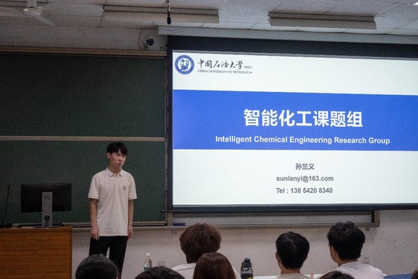智能化工课题组优秀博士生张振宇进行介绍,他围绕人工智能与化工过程的深度融合,讲解了课题组在化工流程智能优化、反应过程数字孪生等方向的研究进展。他结合具体的算法应用案例,向同学们展示了智能技术如何提升化工生产的效率与安全性,同时介绍了课题组在学生培养中注重编程能力与化工专业知识结合的特色,为有交叉学科学习兴趣的新生提供了明确的努力方向。