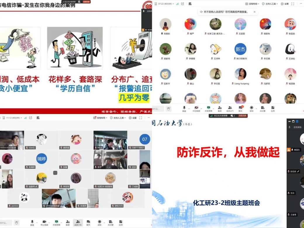 为深入贯彻落实学校关于防范电信网络诈骗工作的指示精神,切实提升硕博研究生的安全防范意识与能力,维护校园和谐稳定,9月27日,学院组织硕士博士研究生各班班委、党支部书记召开安全教育工作会。研究生辅导员薛慧传达相关工作要求。学院全体研究生、博士生班级陆续组织召开了安全工作主题班会。