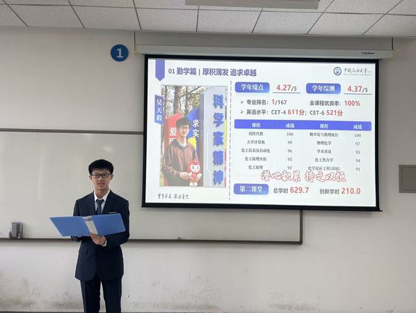 在答辩现场,候选学生们准备充分,沉着自信。他们结合精心制作的演示文稿,系统梳理并展示了自己在过去一学年中取得的丰硕成果。无论是专业学习上的名列前茅、科研竞赛中的突破创新,还是学生工作与社会实践中的积极奉献,都清晰展现了2022级学子勤学笃行、锐意进取的精神风貌。每位候选人的陈述不仅是一份成绩单,更是一幅成长的画卷。