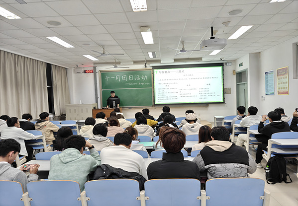 活动伊始,应化2502团支书颜欣冉登台,宣告本次活动正式启幕。随后,主讲人王光硕开始讲解。在新闻写作板块,王光硕先明确了新闻的概念与核心要素,强调真实、客观、时效是新闻的基础属性,并详解了“三段式”写作法:开头需精准抓取时间、地点、人物等关键信息,正文按活动流程梳理事件过程,结尾则要结合活动意义与参与者感受适度升华,同时提醒了稿件格式、审核规范等细节,避免主观表述,确保内容严谨。紧接着,摄影基础部分则从相机操作与创作逻辑入手:先解析了曝光三要素(光圈、ISO、快门)的调节逻辑,比如大光圈可虚化背景突出主体,高ISO能提升暗光环境亮度但会增加噪点;随后介绍了焦段选择、常见档位及中心构图、水平线构图等实用技巧,还针对班会、大型活动等场景给出了拍摄重点。培训尾声,王光硕补充了摄影后期的基础方法,包括用手机编辑或专业软件(Lightroom,Photoshop)调整亮度色彩等,帮助参与者实现素材的优化提升。