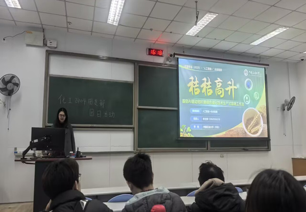 活动伊始,李文婷结合自身参与科研项目,双创比赛如中国国际“互联网+”大学生创新创业大赛、全国大学生化工设计竞赛等赛事的经历,为支部成员带来了干货满满的讲座。李文婷从科研入门路径、课题选择技巧、团队协作方法等方面展开,详细讲解了如何结合化工专业特色寻找科创方向,如何利用学院官网师资信息对接感兴趣的课题组,以及文献检索、数据处理、PPT路演等实用技能的提升方法。针对低年级学生普遍存在的“缺乏科创经验”“专业知识不足”等困惑,李文婷鼓励大家“勇敢迈出第一步,试错也是成长”,通过课余时间学习B站教程、向他人请教、参与课题组实践等方式积累经验,让在场团员深受启发。在随后的互动提问环节,支部成员围绕科创入门路径、国创项目选题、路演技巧等核心问题积极发问,问题直击低年级学生参与科创的痛点难点。 李文婷结合自身国创赛参赛经历,现场展示了“秸秸高升——AI驱动秸秆糖绿色催化技术生成甘露糖”项目的路演PPT,通过直观的页面演示,详细拆解了项目从行业背景分析、创新方案设计到成果展示、财务规划的完整逻辑框架。整场提问与路演展示相结合的环节,让支部成员不仅直观学习了优质科创项目的包装与呈现技巧,更在针对性答疑中明晰了科创实践的关键节点,进一步激发了主动参与科创项目的热情与信心。