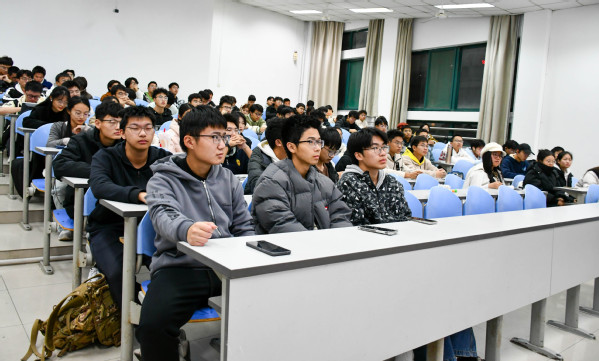 互动答疑环节,任绪乾针对学子关切逐一回应:参与科创竞赛可通过关注学校/学院通知、对接大创项目、联系师生获取机会;还需平衡学业、学生工作与科创,避免舍弃任一维度,通过高效执行与积极交流实现全面发展。现场学子专注记录,互动响应积极。