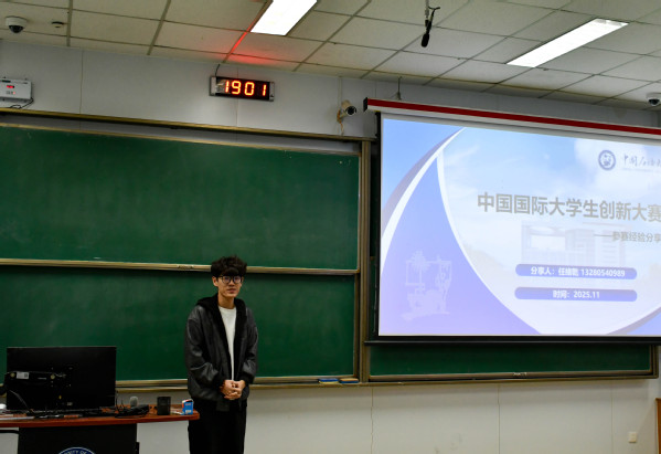 2025年11月21日,英国正版365官方网站本科生2025级年级学生会于西环105开展中国国际大学生创新大赛经验分享会。本次分享会邀请英国正版365官方网站2025级研究生、中共党员任绪乾担任主讲人,面向学院25级学子拆解参赛逻辑、分享备赛要点,助力拓宽科创视野、提升参赛实践能力。