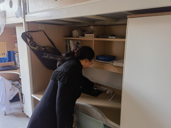 巡查过程中,三位老师秉持“严标准、细排查”的原则,对每间宿舍进行全面检查。重点聚焦宿舍用电安全,逐一核查是否存在违规使用大功率电器、插排私拉乱接及上床使用等危险行为,仔细查看电源开关、线路老化情况,同时检查阳台、楼道是否堆积杂物等消防安全隐患,并现场向同学们重申“人走断电、安全用电”的重要性,引导大家规范使用电器、及时清理杂物,从源头杜绝安全事故发生。