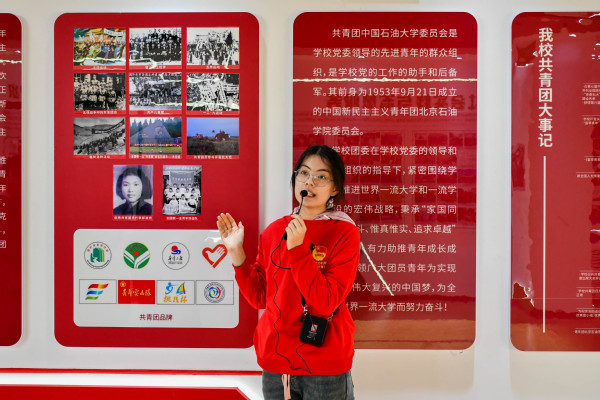 活动伊始,展厅讲解员以展板内容为依托,系统讲解共青团的发展历程:从中国共产主义青年团的成立初心,到中国石油大学共青团的前身——1953年9月21日成立的中国新民主主义青年团北京石油学院委员会,再到学校团委“家国同心、艰苦奋斗、惟真惟实、追求卓越”的工作理念。讲解中,讲解员重点解读了“我校共青团大事记”板块,梳理学校团委在组织建设、思想引领、青年服务等方面的关键节点,让成员们直观感知校团委与青年共成长的历程。