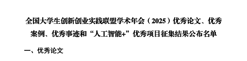 12月4日至6日,全国大学生创新创业实践联盟学术年会(2025) 暨“人工智能+”产学研融合发展论坛在北京召开。在本次“四优”评选征集中,我院曾景斌教授荣获“指导教师优秀事迹”(全校2人),王兆兴、钱立坤、曹建琳撰写的“‘以菌为鉴,守护舌尖安全——食菌速检’项目创新创业实践案例”荣获优秀案例(全校2项),2023级本研化工专业学生李文婷负责的《秸秸高升——首创 AI 驱动秸秆糖绿色催化技术生成甘露糖工作流》获“人工智能+”优秀项目三等奖(全校2项),王兆兴、曾景斌撰写的《医工交叉视域下工科院校双创育人‘三链协同’模式实践》入选年会论文。这些个人与事迹的荣誉表彰充分展示了我院创新创业教育成果。
