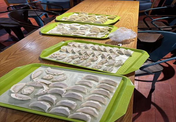 等待饺子下锅的间隙,成员们围绕冬至习俗展开交流,分享南北地域的节气差异与家乡的冬至记忆,从“娇耳驱寒”的古老传说到如今阖家团圆的节日寓意,在互动中深化了对传统节气文化的认知。当一锅锅热气腾腾的饺子出锅,浓郁香气扑面而来,大家围坐品尝亲手制作的劳动成果,咬下一口,鲜汁四溢、暖意盈怀。餐桌上,大家畅谈学习生活趣事,交流包饺子的心得感悟,陌生感在协作中消融,情谊在分享中升温,荟萃食堂俨然成为充满凝聚力的“青春大家庭”。