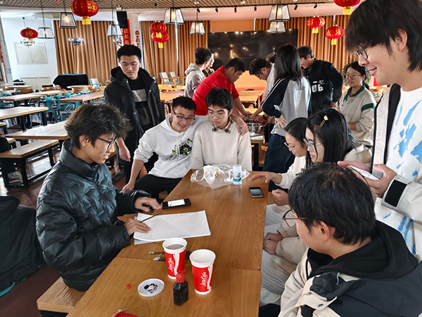 活动伊始,团支部书记赵梓安向支部成员介绍了冬至的由来与习俗,让支部成员们对这一传统节日有了更深刻的认识。随后,包汤圆和九九消寒图绘制环节同时拉开帷幕。团支部提前准备好糯米粉、温水、黑芝麻馅、毛笔,画纸等材料,支部成员们围坐在一起,分工协作,各司其职。有的揉面团,将糯米粉与温水充分搅拌后反复揉搓,直至面团光滑细腻;有的巧手包馅,轻轻捏合、搓圆,最终一个个圆润饱满的汤圆在支部成员手中诞生。有的则齐聚另一侧,发挥创意绘制九九消寒图,大家手绘梅枝与九朵梅花,一笔一划间尽显巧思,用传统的方式迎接数九寒天的到来。过程中,支部成员们互相学习技巧,分享经验,现场洋溢着互帮互助、其乐融融的温馨氛围。